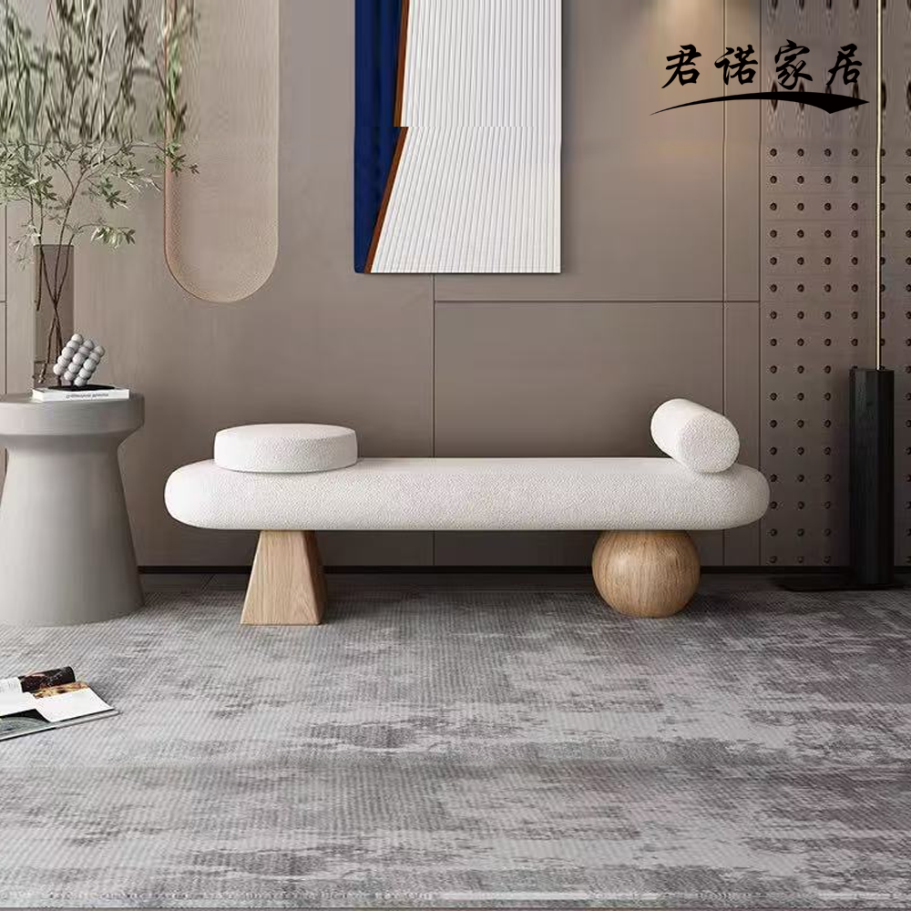 Her iki ucunda da dolgun ve yumuşak çizgiler oluşturan silindirik dolgulu yastıklar bulunan düzgün şekilli, uzun döşemeli bir koltuğa sahiptir. Destek yapısı asimetrik bir tasarımı benimser: bir ucu üçgen masif ahşap blok, diğer ucu ise sağlam bir yapı sağlarken güçlü görsel gerilim oluşturan küresel masif ahşap bloktur. Beyaz oyuncak yünü/kuzu yünü kumaş, doğal ahşap renkli masif ahşap desteklerle keskin bir kontrast oluşturuyor. Kumaşın yumuşak ve kabarık dokusu ahşabın sıcak ve sağlam hissini tamamlayarak sıcak ve katmanlı bir mekansal atmosfer yaratıyor.